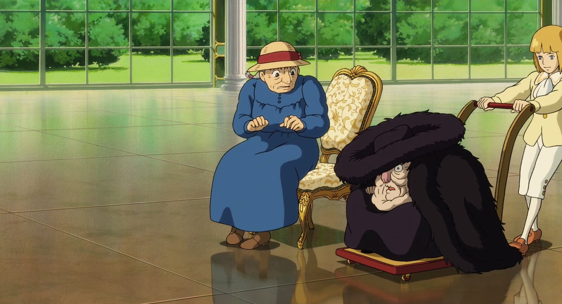 在被荒野女巫施加了魔咒之后,苏菲变成了一个90岁的老太婆。