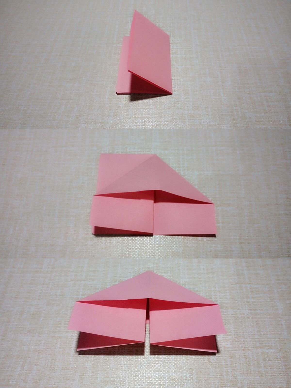 两边沿着中间对折(此时开口向下),打开,沿着折痕向里收,最后压平。