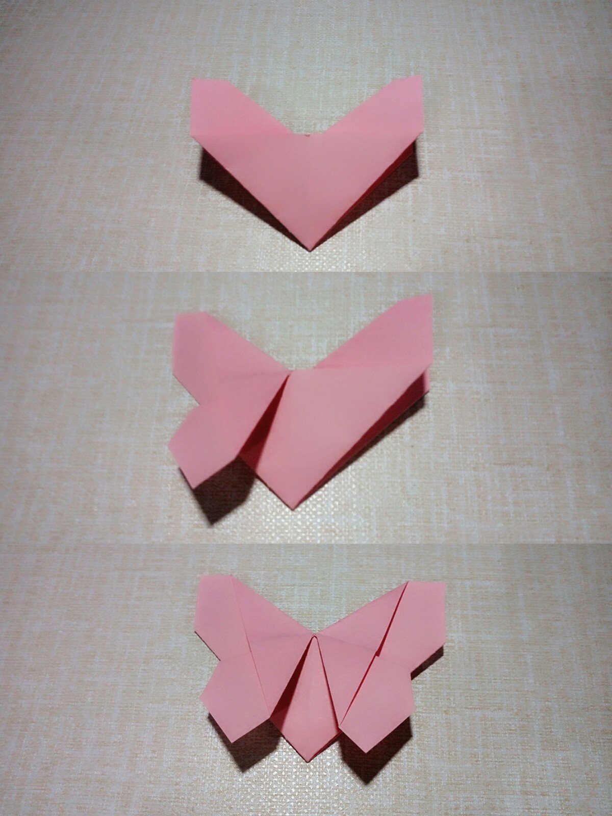 下面部分分别向右向左翻折,最后沿着折痕向里收。