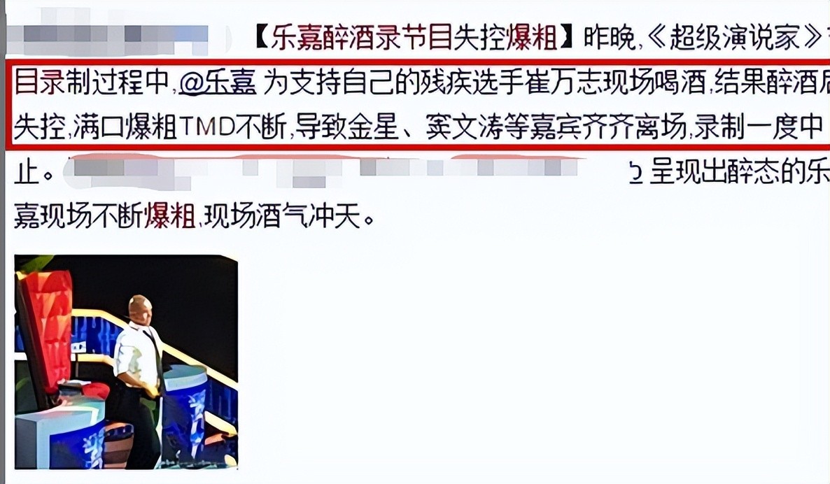 2015年,在《超级演说家》的录制现场,为了鼓励选手崔万志,乐嘉现场表演了酒一口闷。