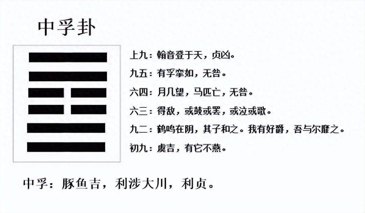 中孚卦是象征正确诚信观的意思。坚持正确的诚信观,恰如豚鱼按时令洄游,重信守诺诸事顺遂。利于克服艰难险阻,宜于长期坚守遵循。