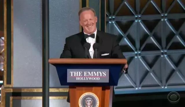 *和预想的一样,颁奖礼上出现了很多川普梗,甚至请来了前白宫发言人肖恩·斯派塞本人出场重现了川普就职典礼时答记者问的一幕,让不少明星(尤其是总在节目中模仿他们的SNL演员)惊喜不已。