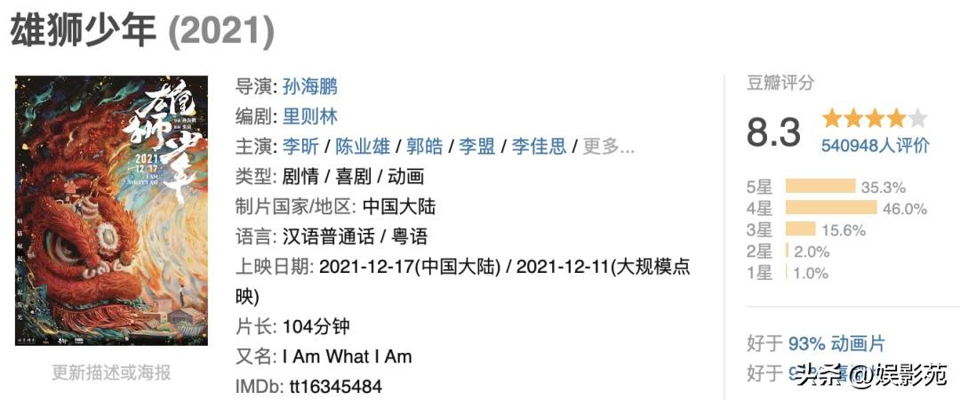 豆瓣评分8.3,《雄狮少年》以岭南文化为背景,从人物的造型、着装、语言到动作,再到电影的配乐和色调,都散发着浓郁的乡野美学。