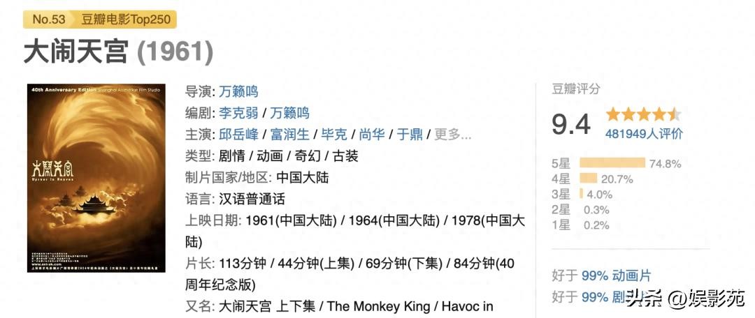 豆瓣评分9.4,作为中国第一部有声彩色动画长片,影片根据古典名著《西游记》中的故事改编,前后历时4年创作,讲述了孙悟空因不满天庭的不公正待遇,反抗玉帝统治,大闹天宫的故事。