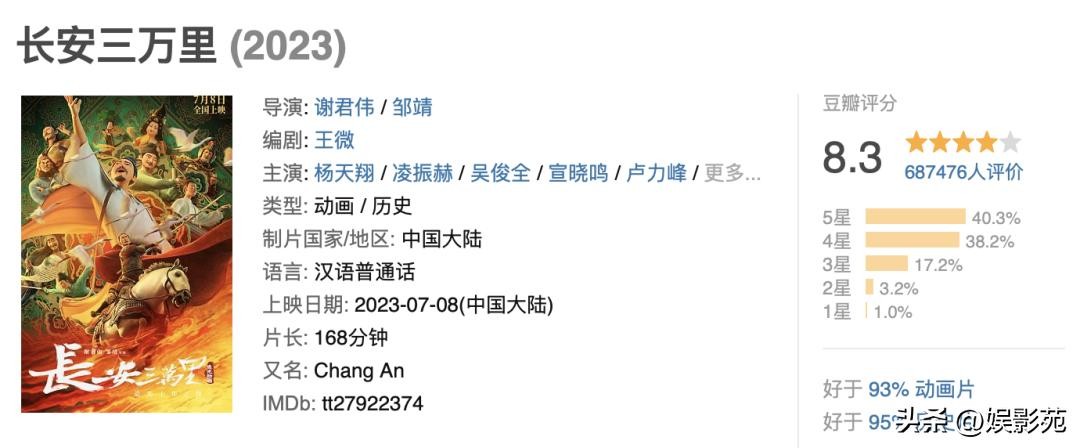 《长安三万里》自2023上映以来,豆瓣评分从开分的8.0升至8.3,总票房累计突破16亿元,是一部口碑与票房双丰收的动画佳作。