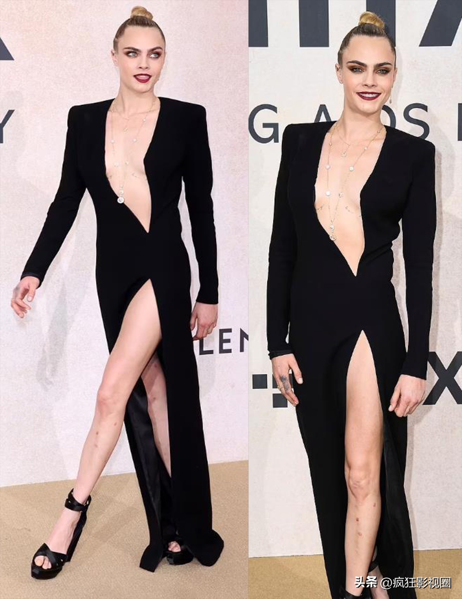 卡拉搭配了一双黑色皮革高跟鞋,让她176cm的超模身材看上去更加亮眼。