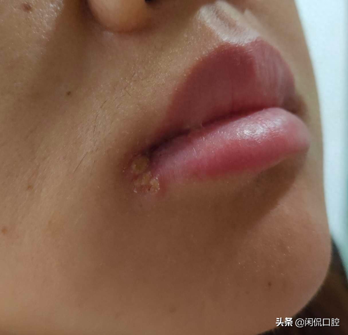 这种情况属于比较典型的单纯疱疹病毒(简称HSV)感染引起的唇部单纯疱疹(简称为唇疱疹)。人类是单纯疱疹的天然宿主,主要是口腔、皮肤、眼、会阴及中枢神经系统容易受累。目前HSV有两个血清型:HSV1和HSV2。一般来讲。前者主要是导致口腔粘膜、咽、口周皮肤、面部、腰以上皮肤粘膜及脑的感染;后者则主要引起腰以下皮肤粘膜及生殖器的感染。不过虽然口腔粘膜损伤主要是HSV1型引起的,也有约10%左右的口腔病变中于拔HSV2的存在;同样的约15%-37%的原发性生殖器疱疹是由HSV1引起的。