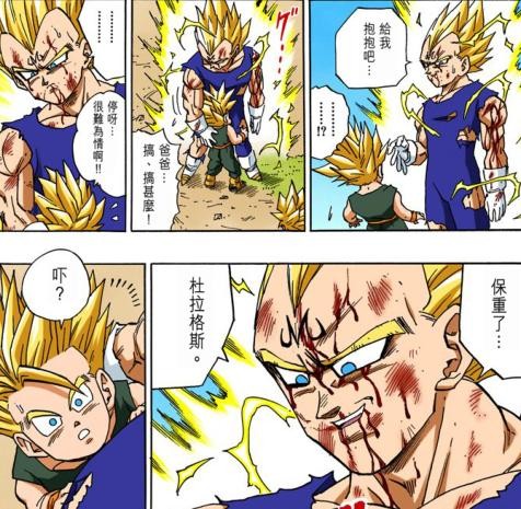 最后贝吉塔父子的深情一抱,黑白色的漫画中,不少人以为贝吉塔哭了,但彩色漫画给出了解释,实际上那只是贝吉塔脸上的血水并不是眼泪。
