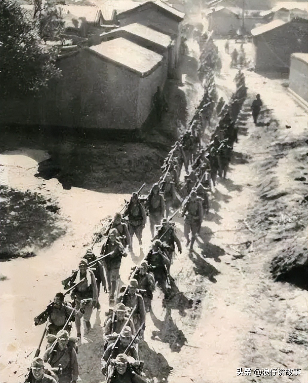 12.占领了我军的一个村庄,这些日军爬到了房屋顶上手舞足蹈。
