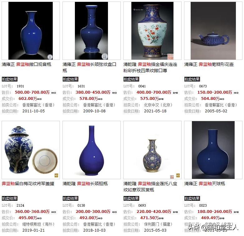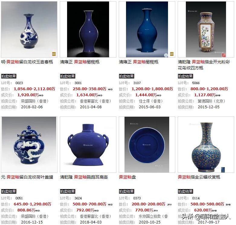 以下是霁蓝釉瓷器的拍卖成交价格记录: