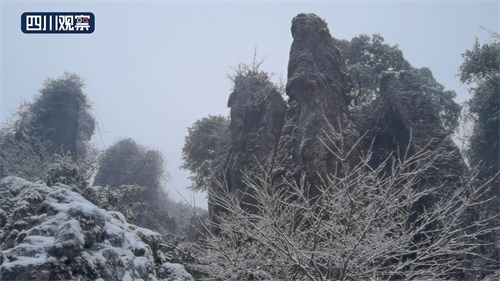 在海拔1704米的四川华蓥山旅游区,零下三度的气温寒意十足,云雾缭绕中的白雪若隐若现,雪花飘落在树木草丛中,将枝条树叶凝结成冰条,晶莹剔透。洁白的雪花与绿色的树木相映成趣,构成了一幅幅精美的山水画,千姿百态,形态各异。