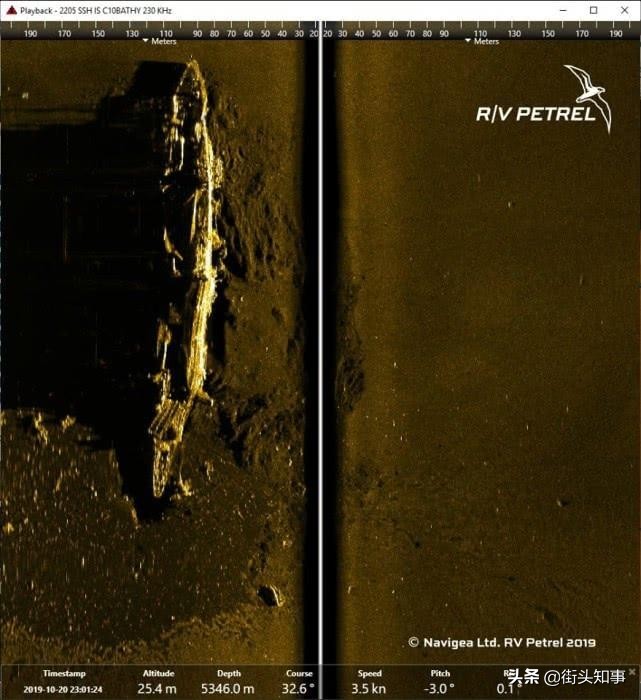 “海燕”号探测器拍摄的“赤城号”航母残骸,显示深度大约为5281.1米(探测器也有误差)。