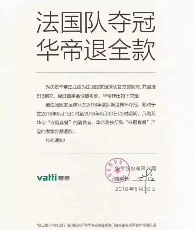 此前,华帝推出“法国队夺冠,华帝退全款”的营销方案,承诺对于在2018年6月1日0时至2018年6月30日22时,凡购买华帝“夺冠套餐”的消费者,华帝将按所购“夺冠套餐”产品的发票金额退款。