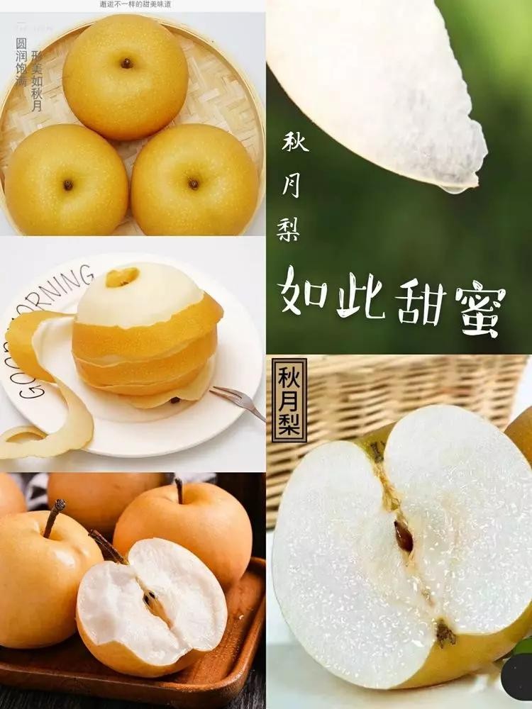 秋月梨:甜润多汁、肉质细腻无渣,脆甜爽口,有清香味,是目前国内最甜的梨品种,香甜如冰糖,非一般梨子可比。