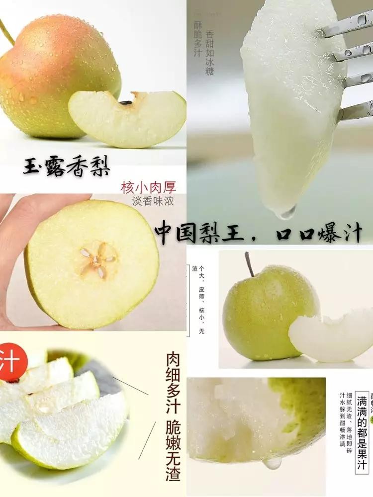 玉露香梨:2013年获得“中国梨王”称号,核小、肉厚,可食率高,皮薄无渣、脆甜多汁,一口咬下,口口爆汁的感觉。