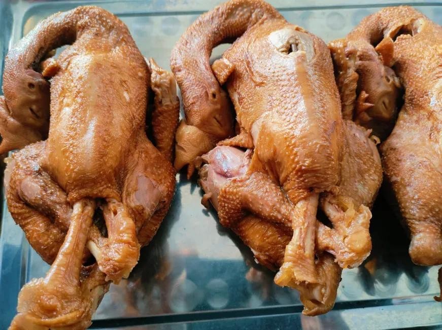回车烧鸡,选用本地一年以上的太行山柴鸡,先把鸡处理干净,然后用纯蜂蜜涂抹于鸡表层,放入调制好的鸡油里炸至金黄捞出,等晾凉后再放入盛有四十年老汤的锅中,用二十余种君臣佐使搭配的中药料包和鸡放到一块用大篦子压好,小火慢炖不低于三个小时后再浸泡五个小时方可出锅。