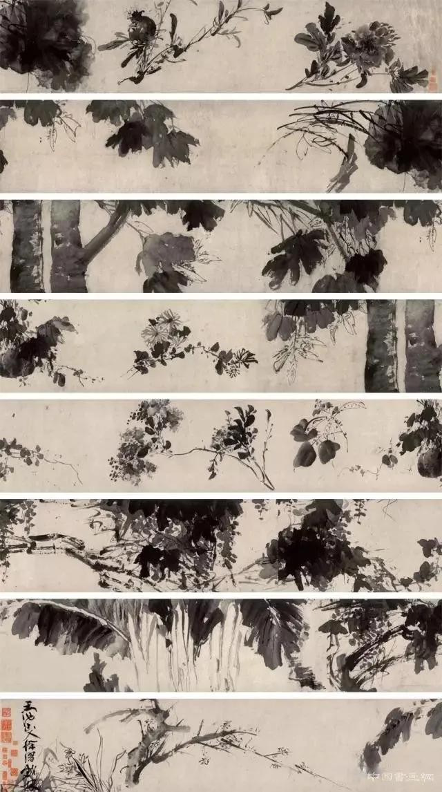 《杂花图卷》是明代杰出的画家、书法家和文学戏剧家徐渭创作的一幅书画作品,是我国古代写意花鸟画集大成者的精绝之作,不愧“天下第一徐青藤”之美誉。画卷长十余米,徐渭以酣畅淋漓之笔法,疾飞狂扫之气势,用焦墨、泼墨、积墨等多种笔法和技法,把牡丹、石榴、荷花、梧桐、菊花、南瓜、扁豆、紫薇、紫藤、芭蕉、梅花、兰花、竹子等13种花卉蔬果表现的淋漓尽致。