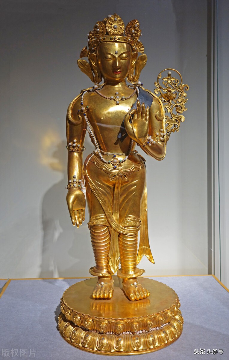 佛像由纯度很高的黄金制成,通高88厘米,佛身与莲座皆装饰华丽,嵌珍珠宝石,雍容华贵,代表了清代宫廷造像工艺最高水平。