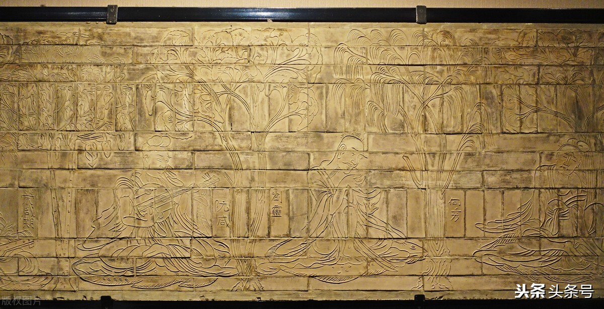 整幅砖画长约4.8米,高约0.8米,出土于南京西善桥某南朝大墓中,是我国考古发现的最早且品相最为完好的大型人物画像砖实物,南朝帝王陵墓装饰壁画,20世纪中国百项考古大发现之一。