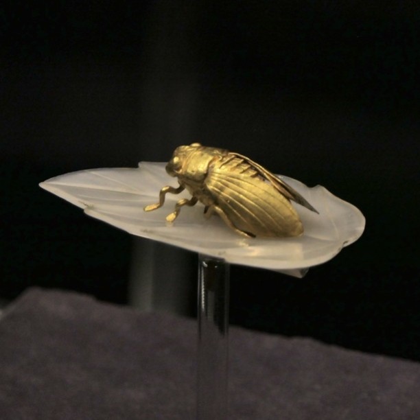 1954年出土于苏州五峰山博士坞明朝张安晚家族墓中。一只金“蝉”立于“玉叶“之上,金蝉侧身翘足,双翼略张,嘴巴微开,蝉翼左右各两。叶片系新疆和田羊脂白玉,打磨细薄呈凹弧状,分为八瓣,是一件构思巧妙、制作精美的稀世工艺珍品。