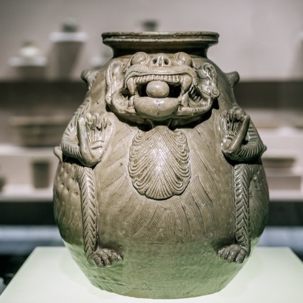 1976年出土于宜兴周处家族墓周墓墩中。西晋青瓷神兽尊造型略微呈梨式,高27.9厘米、口径13.3厘米,底部刻有“东州”二字。神兽的神态惊人,全身刻满纹饰,是我国最早有铭款的瓷器之一。