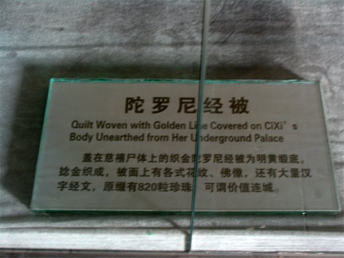 然而,陵墓里盖在慈禧身上的那床陀尼经被也是一件无价之宝却逃过一劫。盖在慈禧尸体上的是一条织金的陀尼经被。被长280厘米,宽274厘米明黄缎底,捻金织成。被面上织有众多佛经、佛像、佛塔、花纹等装饰,全被不但花纹繁多,而且还织有汉字陀罗尼经文25000字。经被上缀有820粒珍珠。盗墓贼拆走了珍珠,将这条价值连城的经被弃之于地,1979年清理地宫时才被发现,免遭危运。