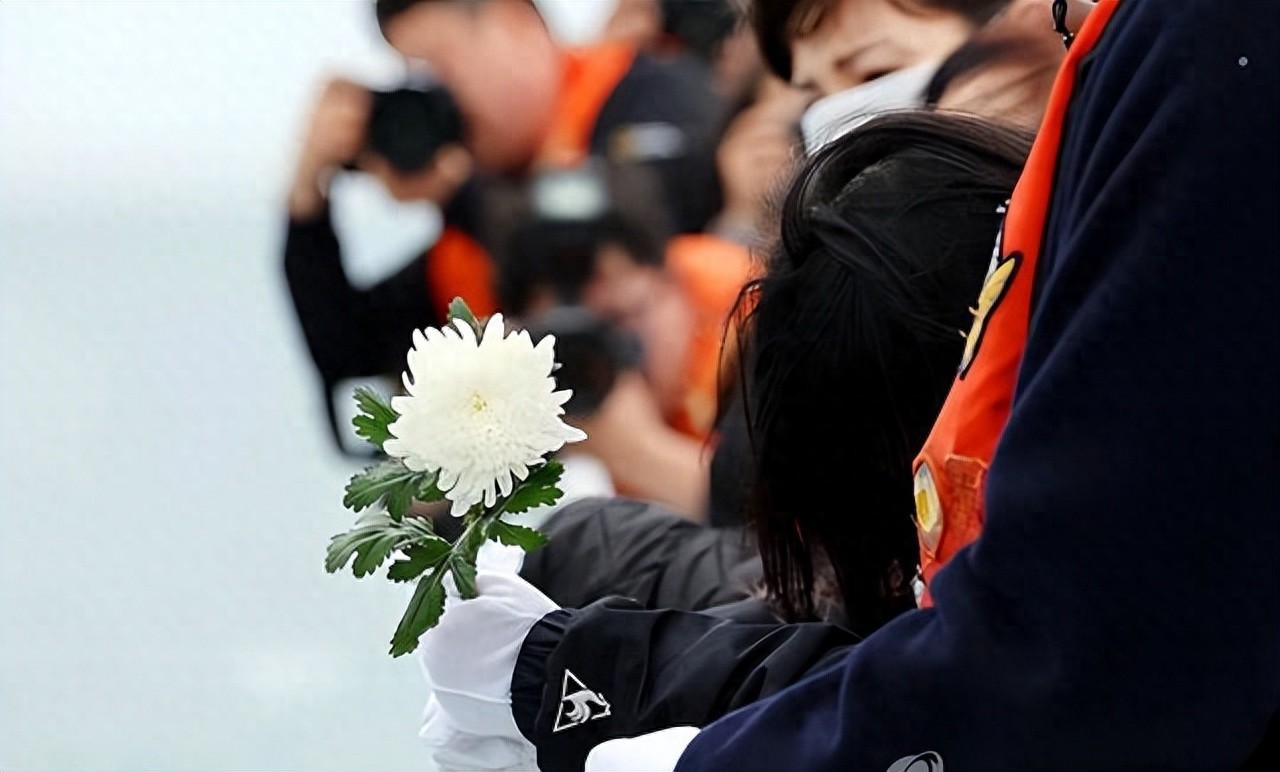 白菊寄托着人们的思念,蕴含着馨香,被洒向大海,遇难者的名字此起彼伏。