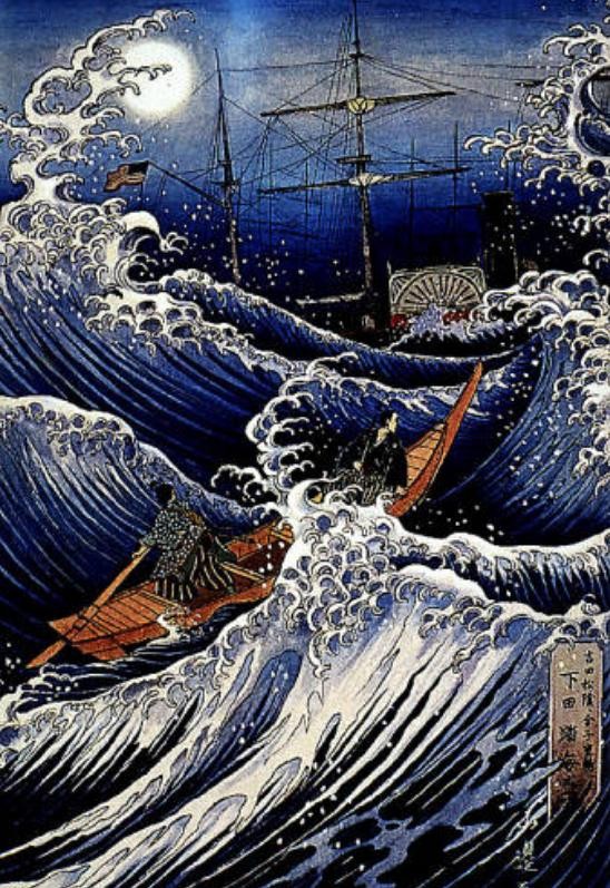 1853年6月,美国培里准将率舰队闯入浦贺港,以不辞一战的高压手段威逼日本开国。当时,吉田松阴正在江户游学,闻取后大惊,立即星夜奔赴浦贺,只见“黑船”气势汹汹,耀武扬威侵入江户湾进行测量,岸上松明火把彻夜不熄,信号钟声时断时续,浦贺奉行等官吏风声鹤唳,手忙脚乱,为了不辱列宗列祖竟匆匆忙忙地派人打扫准备剖腹自尽的寺院。