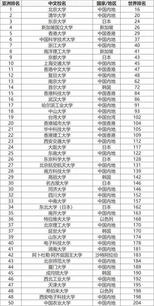 本文以本榜单中的亚洲前50强为例,看看亚洲顶级高校的格局,以及我国有哪些大学入选亚洲前50强。先上完整榜单全图: