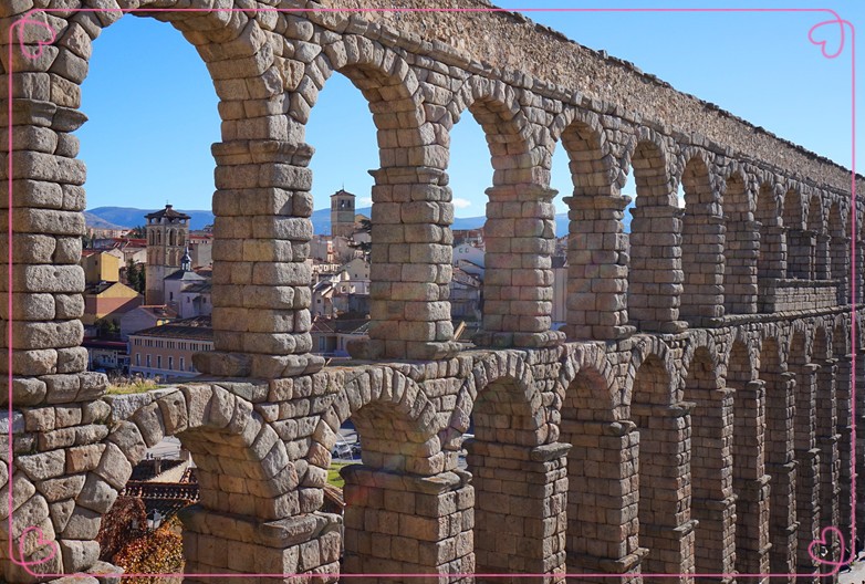 罗马水道桥(高架渠),建于古罗马图拉真大帝(公元53-117年)时代,用土黄色花岗岩干砌而成,石块之间没有使用任何粘接材料,坚固异常。水道桥全长813米,分上下两层,由148个拱组成,高出地面30米,气势非凡。最初罗马人建造这座水道桥的目的,是将18公里外的河水引入城内饮用,至今仍被后人留用,成为塞哥维亚的骄傲。它也是伊比利亚半岛上最雄伟,保存最好的古罗马遗迹。