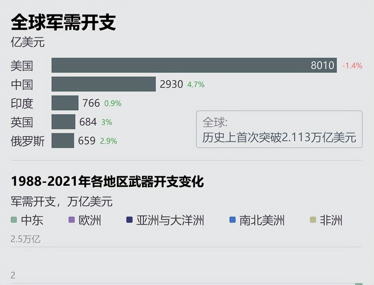 另外,截止2021年开支最高的五个国家分别为美国、中国、印度、英国、以及俄罗斯。其中美国军费开支高达8010亿美元,超越其后几个国家之和,在过去十年中,其军费占全球总和的近四成。