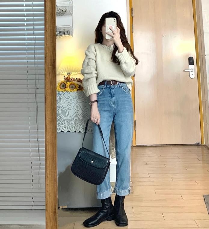 在春季的穿搭中,又怎能少了一件毛衣呢?无论是单穿,还是打底都是超赞的,纯色基础款式毛衣,与九分牛仔直筒裤相配,还是挺好看的,记得毛衣要塞进裤子里面,这样将腰线比例提高了,就能拉长腿部线条,在视觉上呈现出高挑感。