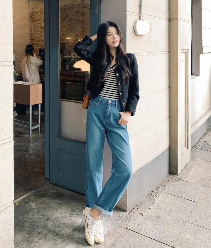 其实,像牛仔裤这种裤子,与什么样的上衣相配都是超赞的,宽松版型的牛仔裤,真的很藏肉显瘦。而且,还能给人一种很休闲舒适的效果,裤子过长的话,可以稍微把裤脚卷起来一些,增加些随性感。
