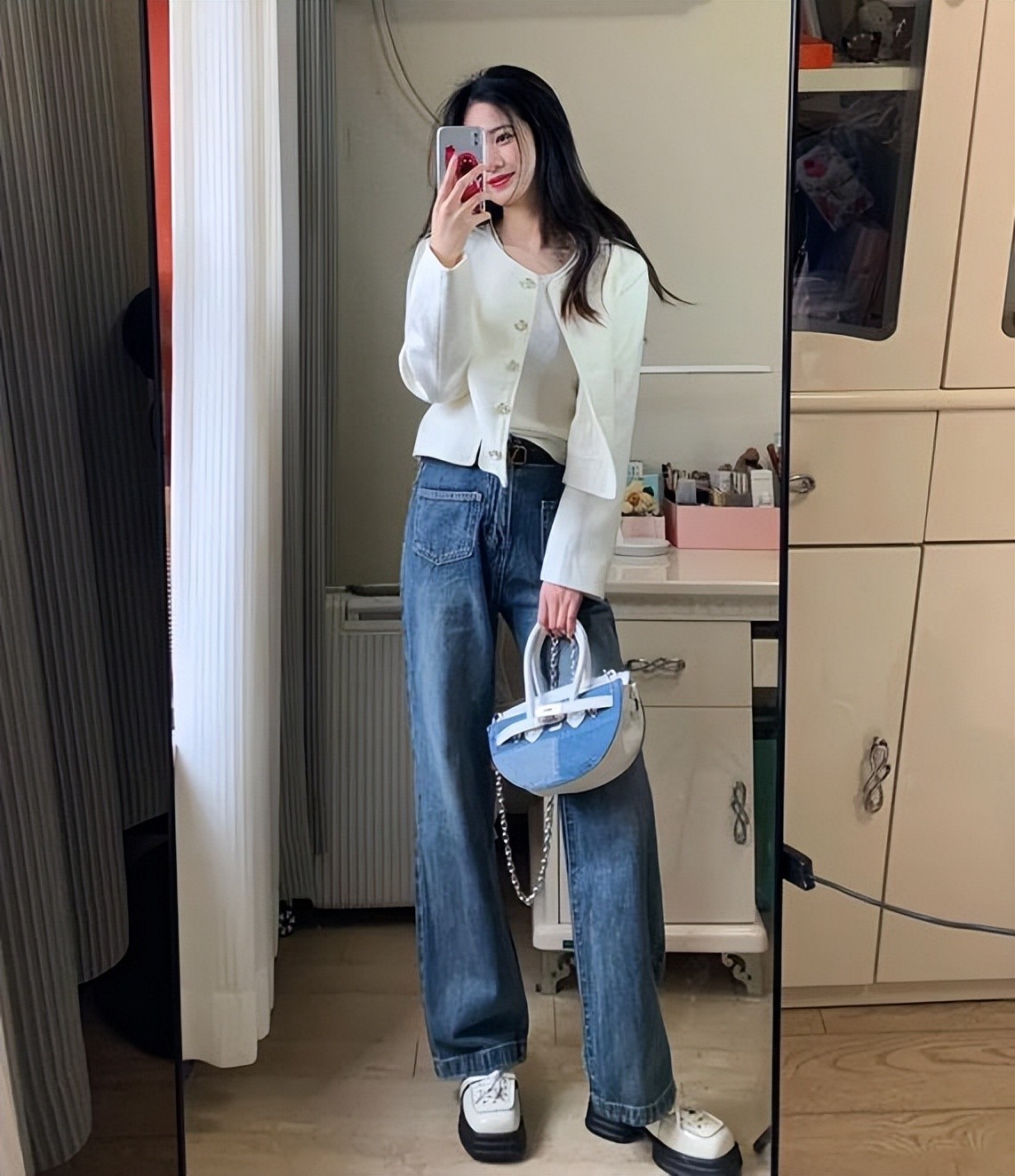 小个子的女生,在选择牛仔拖地裤来穿时,一定要记得把腰线比例给提高起来,这样才能将身材比例进行优化了。
