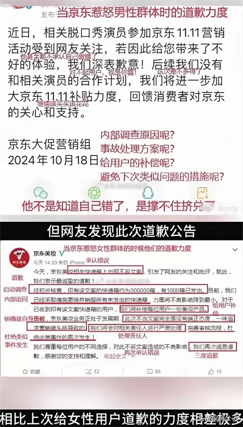 有意思的是,网友发现京东的这次道歉公告,相比上次给女性用户道歉的力度相差极多。