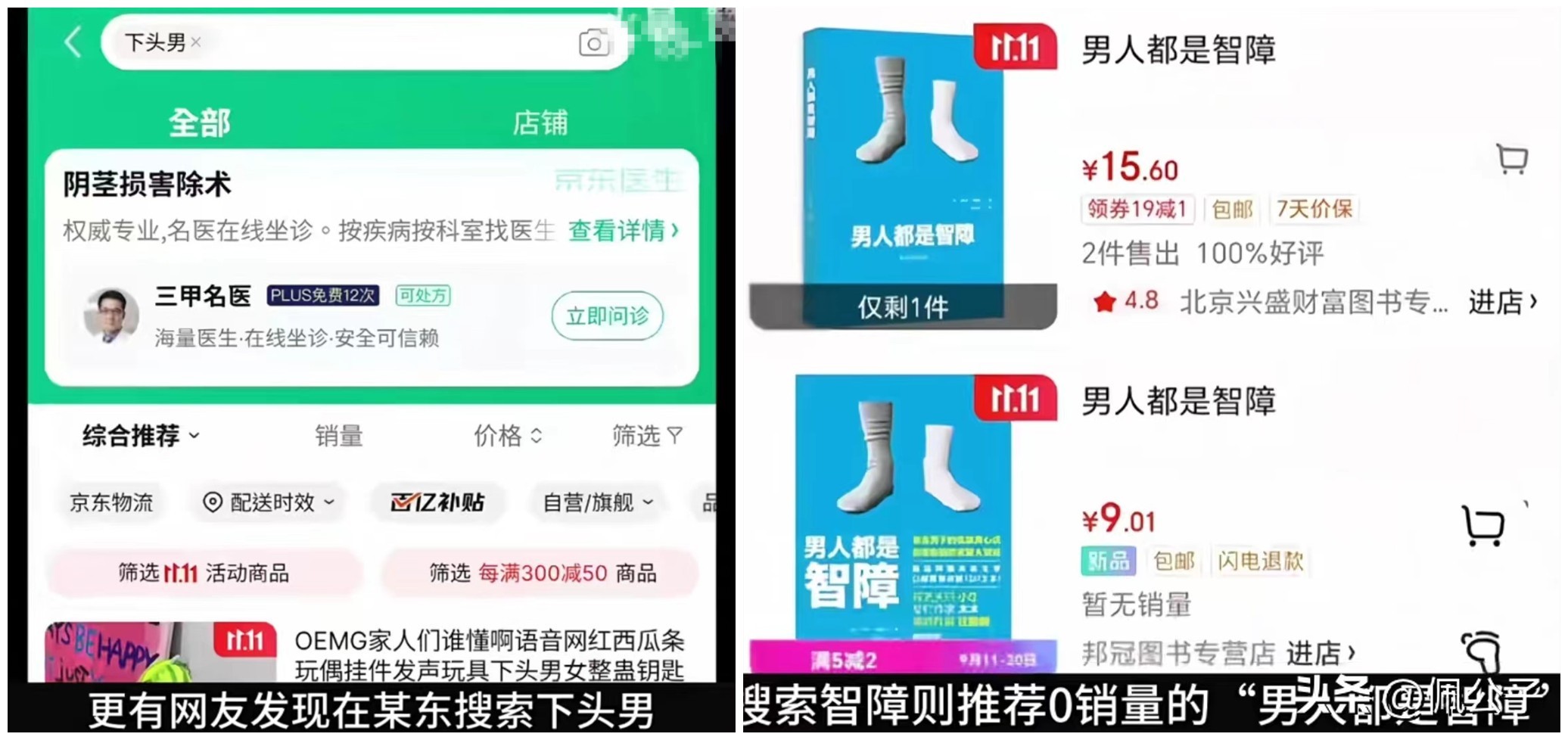 更有网友在某东搜索下头男,会被推荐丁丁切除术。