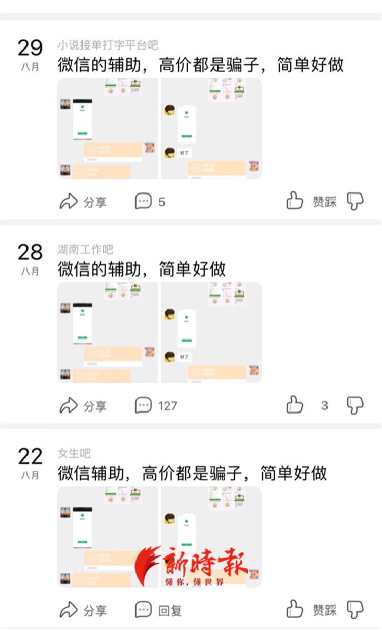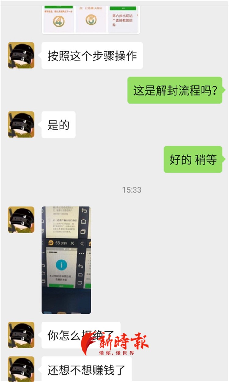 “我加入了很多兼职群,假期我们都不在济南,群里也就有人放网络兼职单。”张茹表示,有次她刷到了微信解封的兼职消息,号称解封成功给20元到50元,非常安全不需要垫付。