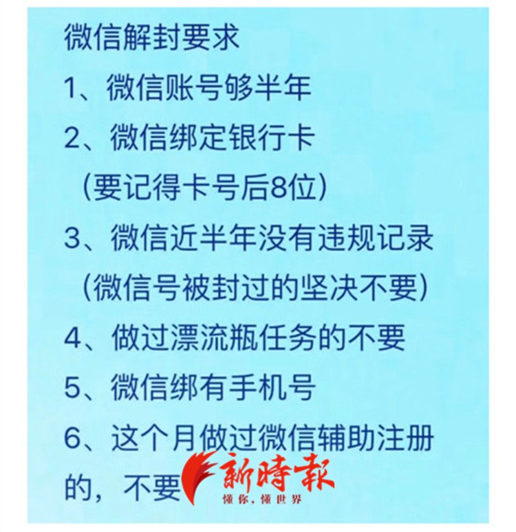 此人先发来一张“微信解封要求”图片,上述:微信账号注册满半年、绑定银行卡、无违规记录、已绑定手机号、本月内未做过微信辅助注册等信息。“上面的条件都合适就可以做,一单给20块钱。”