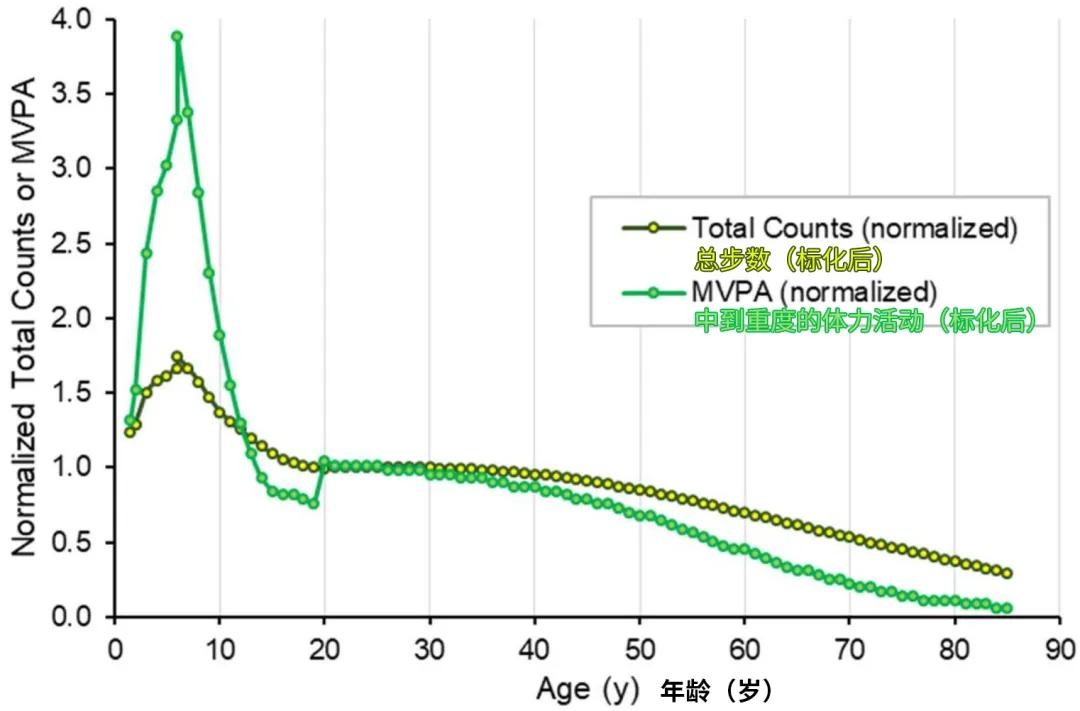 不同年龄的总步数以及中到重度的体力活动量 图源网络