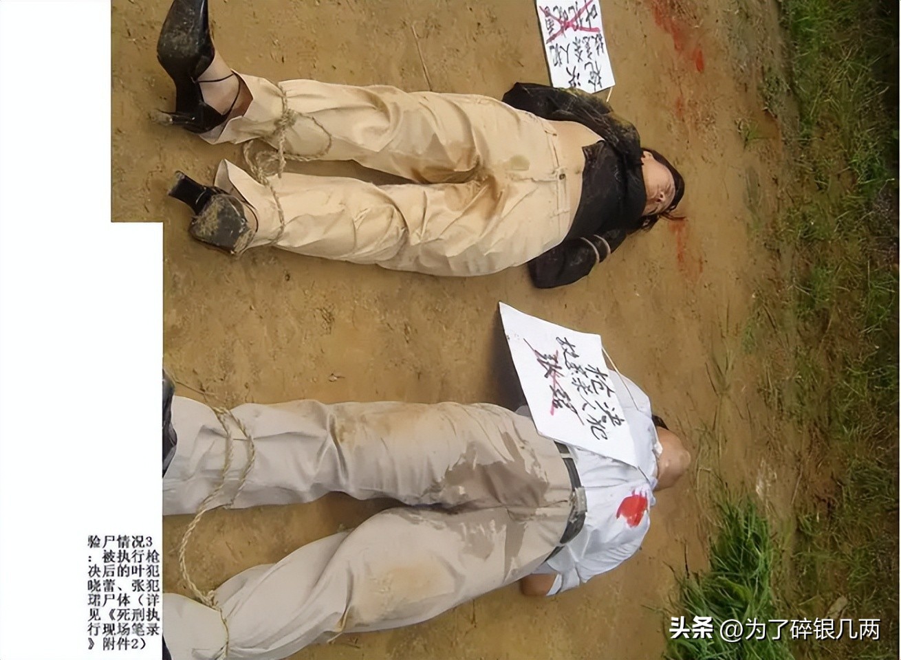 被枪决的两个杀人犯,边上还附带了法医的验尸备注,一个叫叶晓蕾,一个叫张珺,可以看到后面地上有血,两个人裤子都已经被尿湿了。