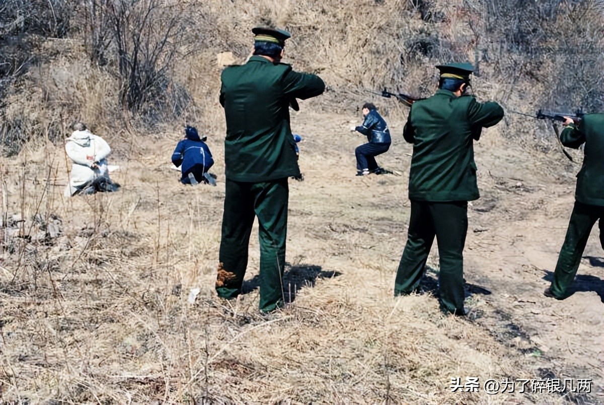 四个死囚跪在地上,后面四个武警拿着步枪对着他们开枪,最右边那一个可能是因为恐惧,直接都要站起来了。