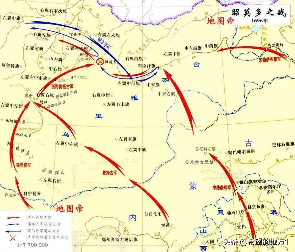格尔丹随即率大军,追入内蒙直取——乌珠穆沁,然后调转锋芒,在内蒙赤峰附近的乌兰布通南下。