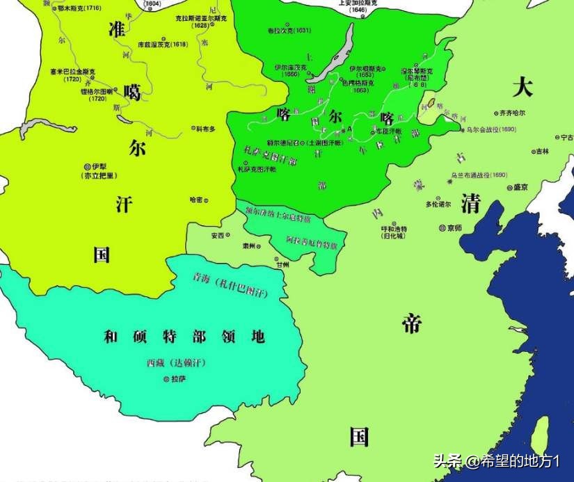 1675年,准格尔部首领葛尔丹打败卫拉特盟主——鄂齐尔图汗,把松散的卫拉特部落联盟,改造成一个中央集权的政权体制,1678年正式建立准噶尔汗国。