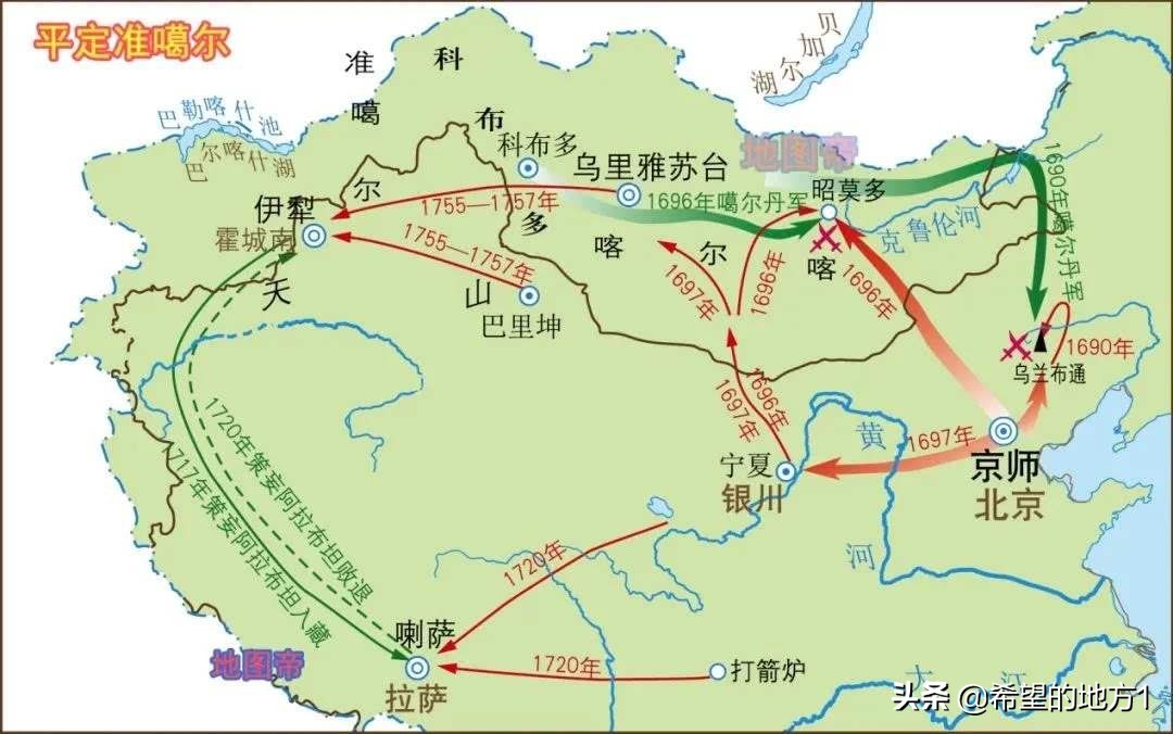 后经康熙,雍正,乾隆三朝六十多年的努力,17576年,清朝中央政府终于彻底平定准噶尔残余势力叛乱。