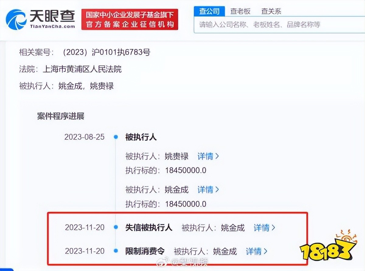 天眼查App的信息显示,姚金成与姚贵禄因一宗案件被强制执行1845万元。案情详情仍是一个谜,但这个庞大的数额引起了社会广泛关注。这是不是意味着RNG老板在某个法律纠纷中吃了败仗?