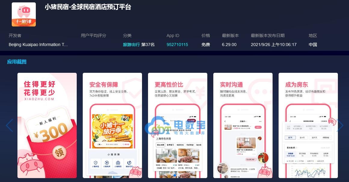 3)小猪民宿累计下载量超1.73亿,行业排名27名,评分4.5;