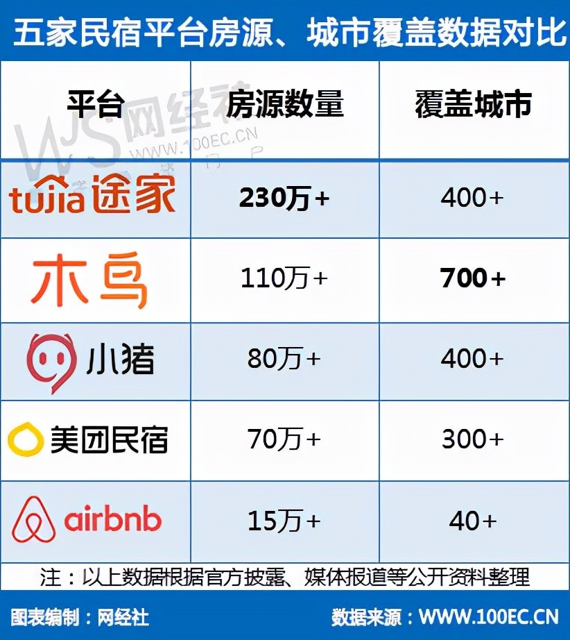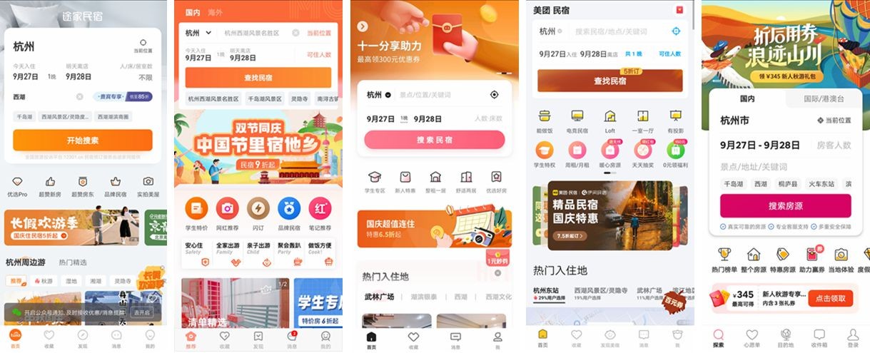 (从左到右依次为途家、木鸟、小猪、美团民宿、Airbnb爱彼迎)