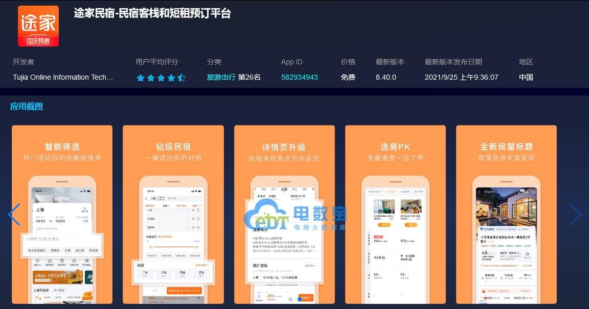 1)途家累计下载量超2.49亿,行业排名第四名,评分4.6;