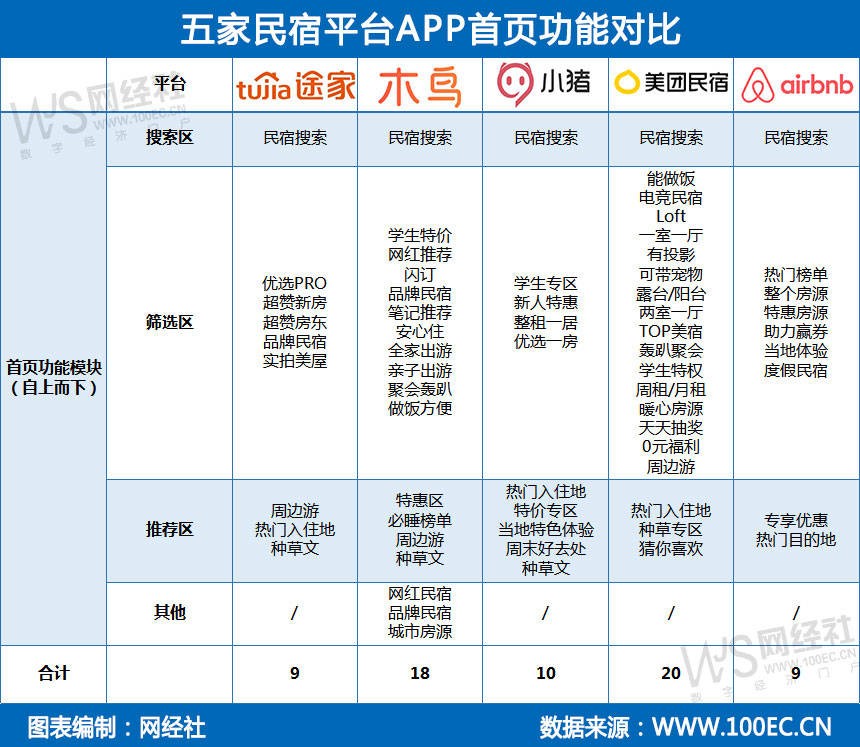 综合来看,Airbnb爱彼迎和途家更加侧重用户的自主搜索为主,而木鸟民宿、小猪短租、美团民宿三家则更侧重平台推荐。