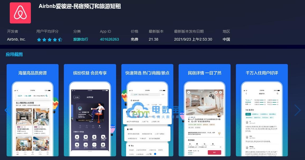 5)Airbnb爱彼迎累计下载量3.56亿,行业排名14名,评分5.0。